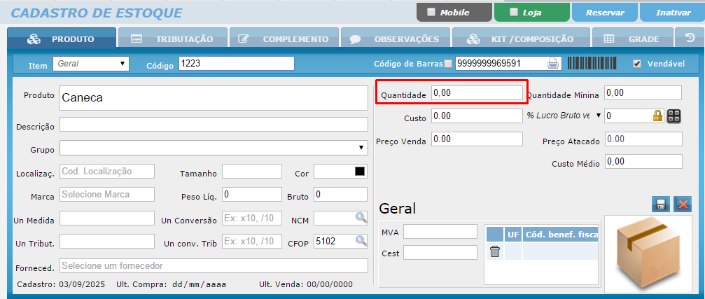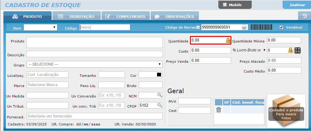 Atualizamos o sistema para aumentar a segurança do seu banco de dados. Ao cadastrar um novo produto, o campo de quantidade fica bloqueado até a finalização do cadastro
