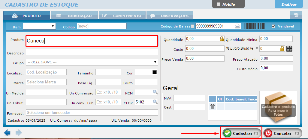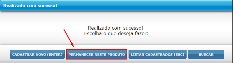 Para liberar o campo para preenchimento é necessário preencher ao menos o campo “PRODUTO”, clicar em ‘CADASTRAR‘ e escolher a opção ‘PERMANECER NESTE PRODUTO‘