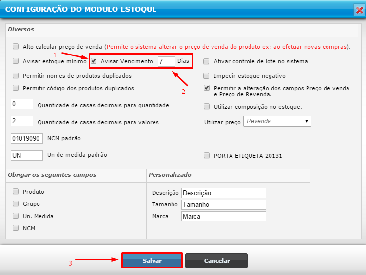 Agora é só marcar a opção ‘AVISAR VENCIMENTO’ e inserir a quantidade de dias que você gostaria que o sistema avisasse com antecedência sobre o vencimento dos produtos. Após esse processo, clique no botão “SALVAR”.