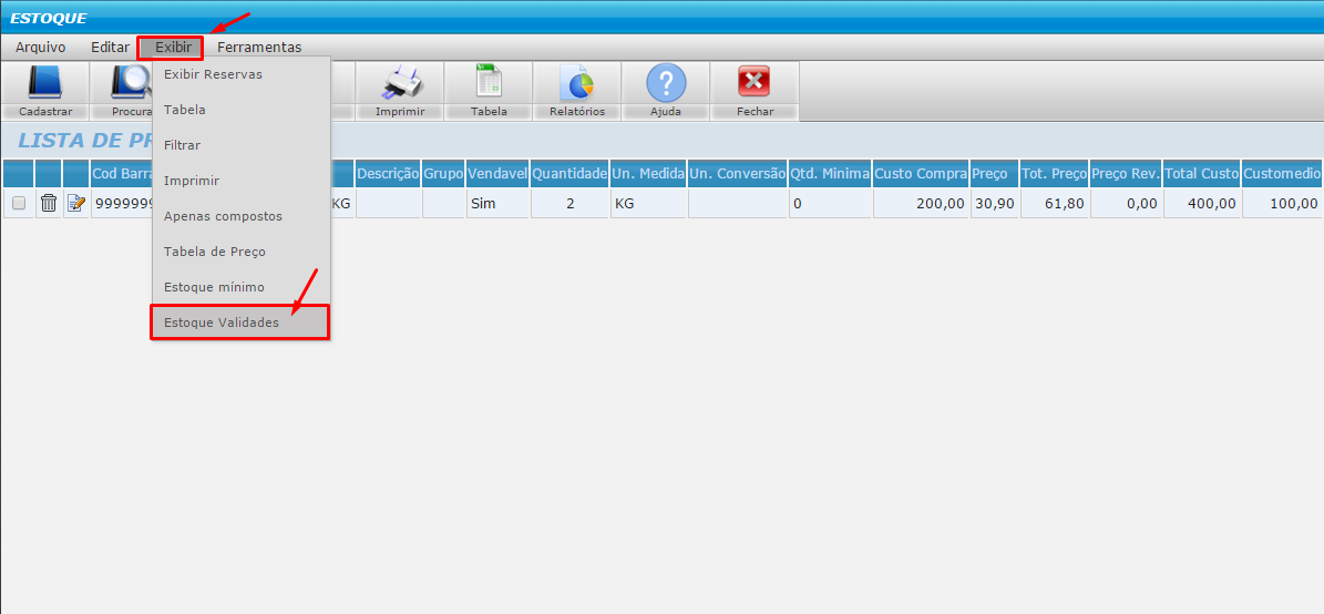 Para acessar essa listagem em outros momentos, dentro do módulo ‘ESTOQUE’ siga para a opção ‘EXIBIR’ e depois selecione a opção ‘ESTOQUE VALIDADES’