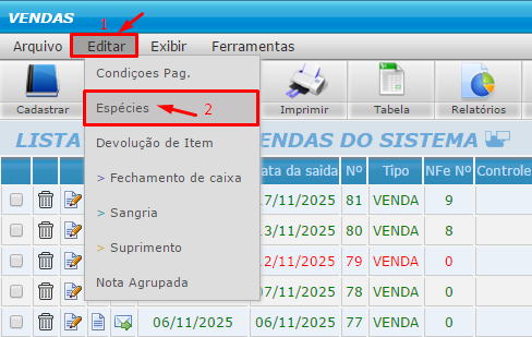 Siga para a aba ‘EDITAR’ e clique na opção ‘ESPÉCIES’