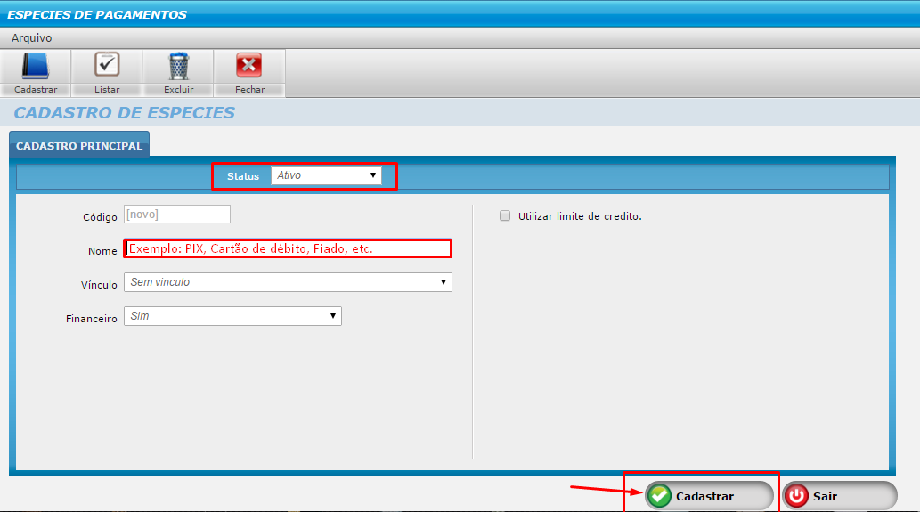 Pronto, agora marque a opção STATUS como ‘ATIVO’ e depois preencha o nome da espécie de pagamento, conforme o exemplo mostrado abaixo. Após o preenchimento clique no botão CADASTRAR.