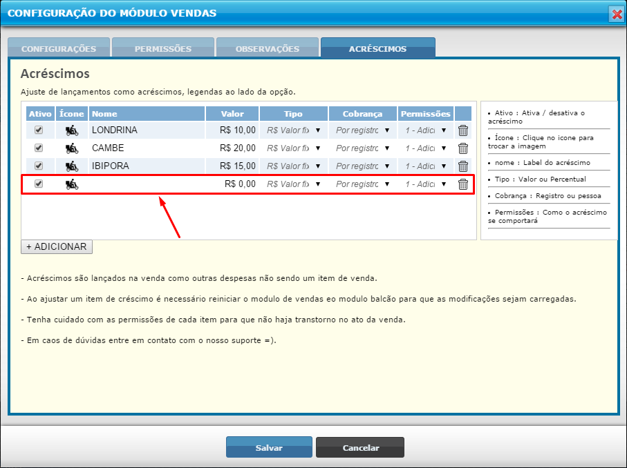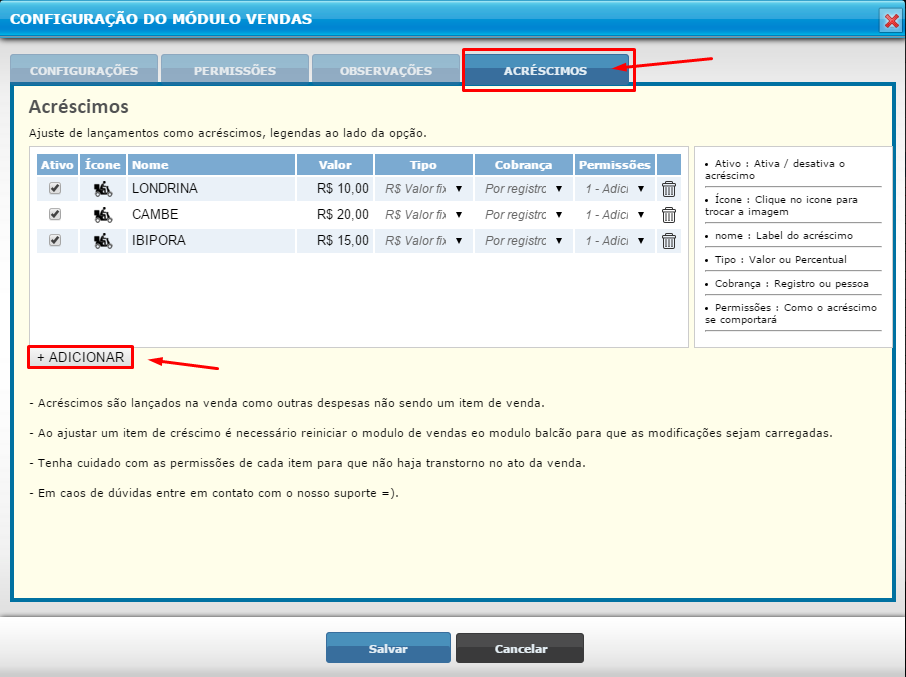 Selecione a aba ‘ACRÉSCIMOS’ e logo em seguida a opção ‘+ ADICIONAR’, conforme imagem abaixo