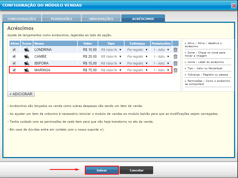 Coluna Tipo – ‘Valor Fixo’ | Coluna Cobrança – ‘Por registro’ | Coluna Permissões – ‘1 – Adicionar’