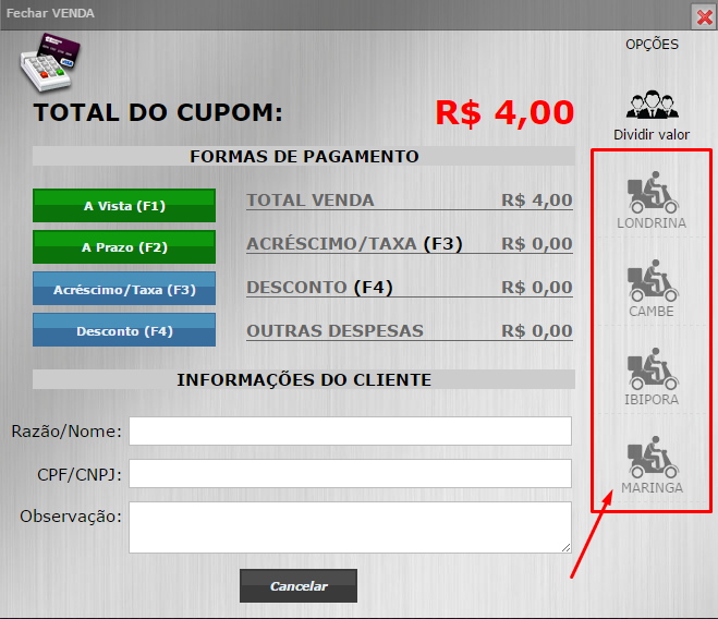 Ao finalizar uma venda no balcão, as opções criadas para o frete irão aparecer no canto esquerdo da tela. Selecione o frete desejado.