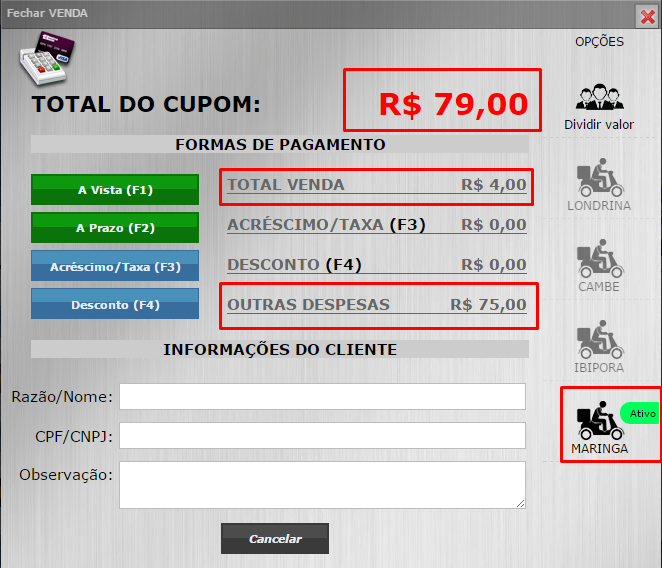 O sistema reconhecerá a opção como ‘ATIVO’, adicionando o valor do frete como ‘OUTRAS DESPESAS’. Preencha as demais informações se necessário e selecione a forma de pagamento para finalizar a venda.