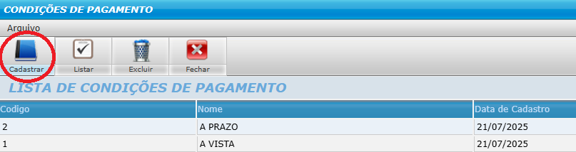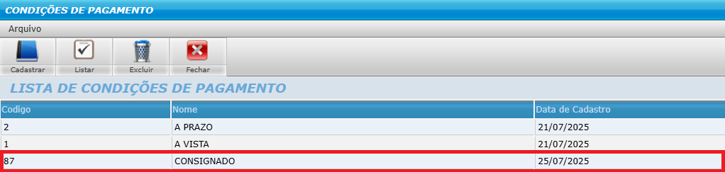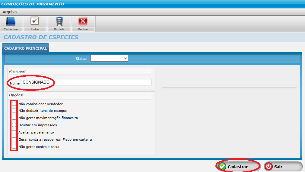 Cadastre a condição de pagamento, exemplo ‘CONSIGNADO’, selecione as opções a preferência e clique em ‘CADASTRAR’